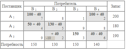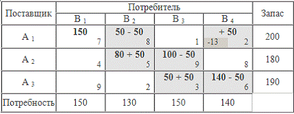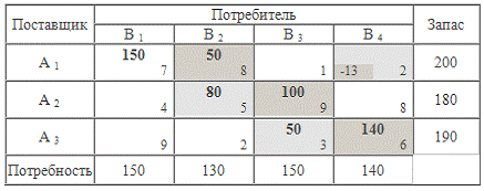 Будем использовать новый маршрут доставки продукции от поставщика A3 к потребителю B2. (ячейка A3B2)
