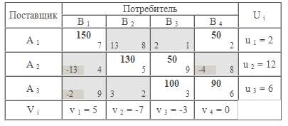 Зная потенциалы, находим оценки незадействованных маршрутов.
