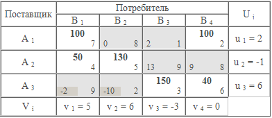 A1B4: v4 + u1 = 2, u1 = 2 - 0 = 23B4: v4 + u3 = 6, u3 = 6 - 0 = 61B1: v1 + u1 = 7, v1 = 7 - 2 = 52B1: v1 + u2 = 4, u2 = 4 - 5 = -12B2: v2 + u2 = 5, v2 = 5 - ( -1 ) = 6