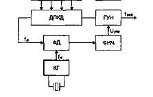 Таким образом выходной сигнал ГУН, кроме подачи его на узел назначения, подается еще и на делитель с переменным коэффициентом деления (ДПКД). Задача ДПКД - делить сигнал частоты ГУН каждый раз так, чтобы на его выходе всегда присутствовал сигнал с частотой fд. Этот сигнал подается на фазовый детектор (ФД). С другой стороны на ФД подается сигнал с кварцевого генератора (КГ) с частотой fкг. Если частоты fд и fкг равны, напряжение на выходе ФД равно нулю. Однако, частота fд несет сигнал расстройки, она нестабильна, и при отклонении ее значения от fкг на выходе ФД образуется управляющее напряжение UУПР, причем с таким знаком, который обеспечивает подстройку частоты ГУН в нужную сторону. Как только ГУН будет подстроен, выходное напряжение системы ФАПЧ станет равным нулю, а выходная рабочая частота синтезатора fраб будет соответствовать заданному значению. Работой ДПКД управляет процессор.