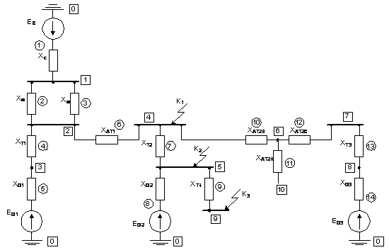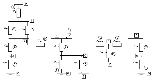 Ветви, по которым ток КЗ не протекает, из схемы исключаются; для коротких замыканий в точках К1 и К2 это обмотка низкого напряжения автотрансформатора АТ2 и трансформатор собственных нужд Т4.