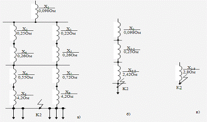 показаны: а) схема замещения т.К2; б) упрощенная схема в) эквивалентная схема
