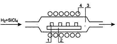 пластины кремния 1 закрепляют на графитовом держателе 2 и помещают в кварцевую