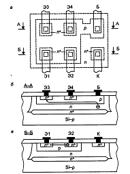 Если один из соседних переходов открыт, а другой закрыт (рис.3, в), то сказывается влияние горизонтальной паразитной структуры типа п-р-п (см. рис.2. в), образованной соседними эмиттерами и разделяющей их р-областью. Через эту структуру протекает ток, потребляемый от источника управляющих сигналов, подключенного к закрытому переходу. Для ослабления паразитного транзисторного эффекта приходится увеличивать расстояние между соседними эмиттерами до 10-15 мкм.