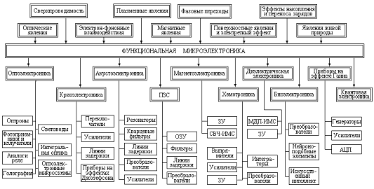 Таким образом, функциональная микроэлектроника охватывает вопросы получения специальных сред с наперед заданными свойствами и создания различных электронных устройств методом физической интеграции, т.е. использования таких физических принципов и явлений, реализация которых позволяет получить приборы со сложным схемотехническим или системотехническим функциональным назначением.