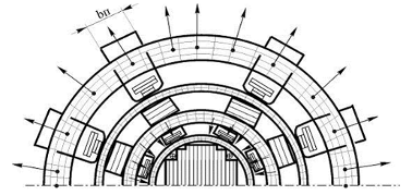 Магнитная система трансформатора является основой его конструкции. Выбор размеров магнитной системы совместно с основными размерами обмоток определяет главные размеры активной части и всего трансформатора. Рассмотрим двухобмоточный трансформатор с плоской магнитной системой стержневого типа со стержнями, имеющими сечение в виде симметричной ступенчатой фигуры, вписанной в окружность и с концентрическим расположением обмоток. Магнитная система такого трехфазного трансформатора показана на рисунке1.