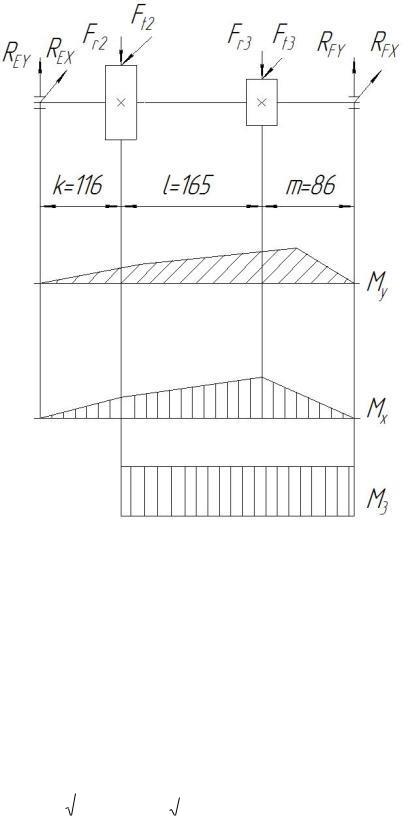 Мх = REY(k+l) – Fr2l= 2156 · 0,281 – 1713 · 0,165 = 323 Н·м;