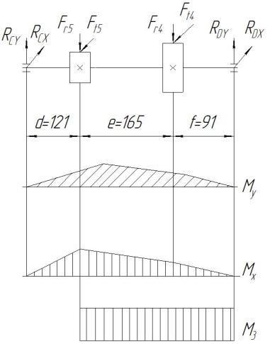 RDY = (Fr5d + Fr4(d+e))/(d+e+f) =(9799·121 + 4200·286)/377 = 6331 Н;