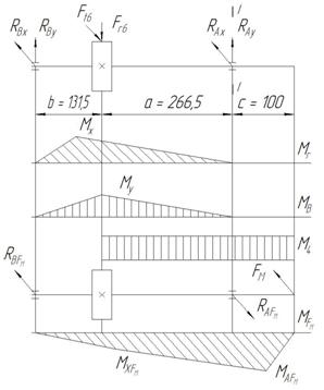 Му = RDX(e+f) – Ft4e = 17394 · 0,256 – 11538 · 0,165 = 2549,1 Н·м;