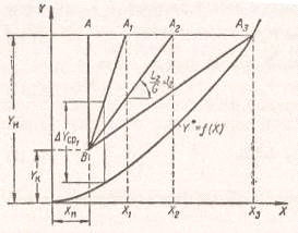 Задаваясь рядом произвольных значений X в интервале между известными значениями Xн и Xк, с помощью уравнения (1.10.) вычисляют t. По опытным данным находят соответствующие значения Y* и строят линию равновесия (по точкам O1, O2 и т.д.).