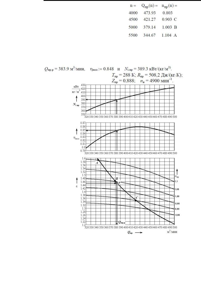 (плавная кривая ABC – линия режимов на рисунке 1). По характеристике нагнетателя определяем расчётные значения приведённых параметров. Для этого проводим горизонтальную линию из ε = 1.45 до линии режимов и находим точку пересечения р. Проводя вертикальную линию через эту точку, находим