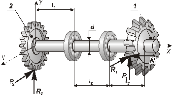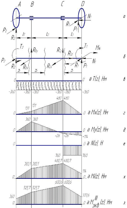 Видно (рис. 2, б), что вал работает на совместное действие растяжения (сжатия), кручения и изгиба в вертикальной (yz) и горизонтальной (xz) плоскостях. Рассмотрим каждую деформацию отдельно, используя принцип независимости действия сил.