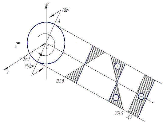 Рассмотрим опасное сечение вала С, в котором действует суммарный изгибающий момент МИ = 480,7Нм, крутящий момент Т = - 360Нм и продольная сила N=-760Н.