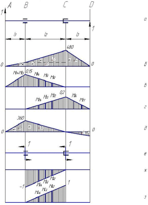 е). Построим эпюры изгибающих моментов