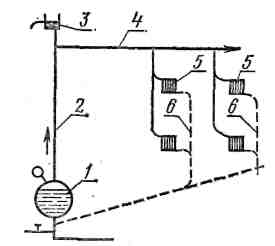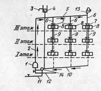 многоэтажного здания: 1 - котел; 2 - главный горячий стояк; 3 - сливная труба;