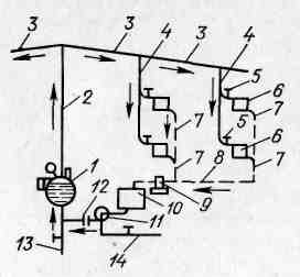 отопительные приборы; б - обратные стояки с охлажденной водой