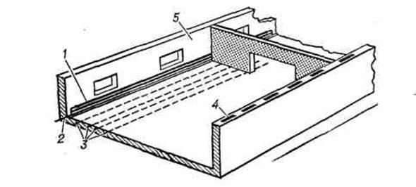 Рисунок 2 - Центральное отопление животноводческого помещения: 1 - нагревательный прибор (радиатор, трубчатый регистр) на стене здания (конвективное отопление); 2 - трубопровод с теплоносителем; 3 - нагревательный прибор (трубопровод, электрический кабель) в полу здания (панельно-лучистое отопление); 4 - нагревательный прибор в стене здания (панельно-лучистое отопление); 5 - отапливаемое помещение