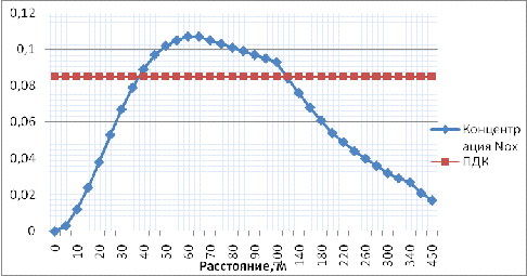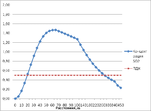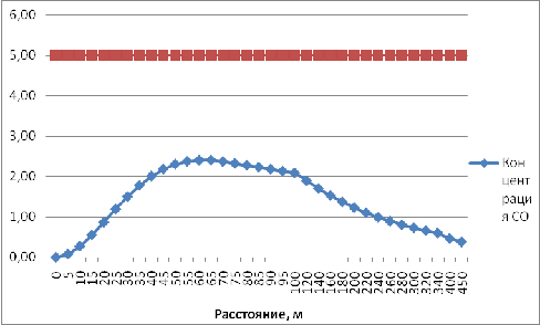 Анализируя график зависимости приземной концентрации оксида углерода от расстояния до источника выбросов можем сделать вывод, что размер расчетной санитарно-защитной зоны без учета розы ветров составляет 65 м.