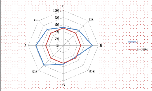 Купянске с учетом розы ветров, где направления сторон измеряется в процентах,