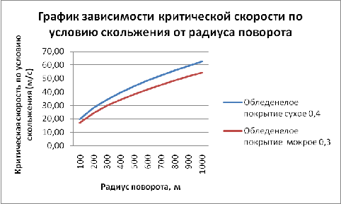 При увеличении радиуса поворота критическая скорость по условию скольжения также увеличивается. Тип покрытия также влияет на критическую скорость по условию скольжения: на обледенелом сухом покрытии критическая скорость больше, чем на обледенелом мокром.