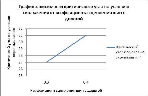 При изменении коэффициента сцепления шин с дорогой критический угол по условию скольжения также изменяется. Для обледенелого сухого покрытия критический угол по условию скольжения минимальный, а при мокром максимальный.
