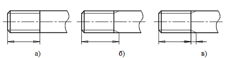. Размер длины резьбы с полным профилем (без сбега) на стержне и в отверстии указывают, как показано на рисунке 1.25 а и рисунке 1.26 а. Размер длины резьбы (со сбегом) указывают, как показано на рисунках 1.25 б и 1.27 б. При необходимости указания величины сбега на стержне размеры наносят, как показано на рисунке 1.25 в.