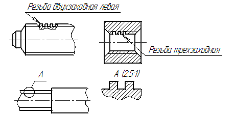 . Резьбу с нестандартным профилем показывают одним из способов, изображённых на рисунке 1.28, со всеми необходимыми размерами. Кроме размеров и предельных отклонений резьбы, на чертеже указывают дополнительные данные о числе заходов, о левом направлении резьбы с добавлением слова «Резьба».