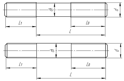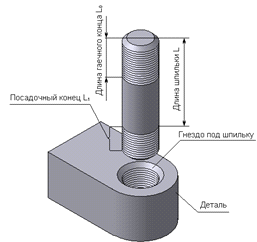 Шпильки выпускаются по ГОСТ 22032-76 - ГОСТ 22043-76 классов точности А и В с диаметром резьбы 2-48 мм и длиной 10-300 мм (рис. 2.8), где L - длина шпильки, указываемая в обозначении, L0 - длина гаечного конца (без сбега), L1 - длина резьбы, включая бег ввинчиваемого посадочного конца шпильки. При этом L1 = d для ввинчивания в резьбовые отверстия в деталях из стали, бронзы, латуни и титановых сплавов; L1 = 1,25∙d и 1,6∙d - в деталях из ковкого и серого чугуна; L1=2∙d и 2,5∙d - в деталях из легкого сплава.