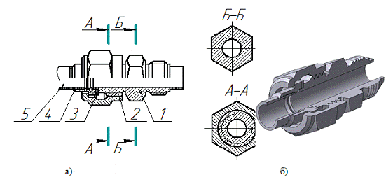 (1) при помощи накидной гайки (2). Герметичность соединения обеспечивается