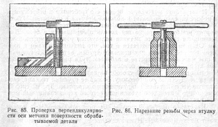 в процессе нарезания необходимо тщательно следить за тем, чтобы не было перекоса метчика; для этого надо через каждые две-три нарезанные нитки проверять с помощью угольника положение метчика по отношению к верхней плоскости изделия; особенно осторожно нужно нарезать резьбу в мелких и глухих отверстиях. Нарезанную внутреннюю резьбу проверяют калибрами-пробками.