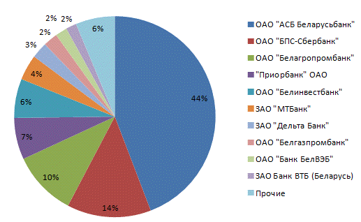 Самым крупным банком-эмитентом в стране является ОАО «АСБ Беларусьбанк», на долю которого на 01.07.2014 приходилось 5,6 млн. единиц всей эмиссии карточек. Также лидирующие позиции по эмиссии карточек занимают: ОАО «БПС - Сбербанк» - 1,7 млн.единиц, ОАО «Белагропромбанк» - 1,3 млн., «Приорбанк» ОАО - 0,9 млн., ОАО «Белинвестбанк» - 0,8 млн.единиц. [28, c. 64]