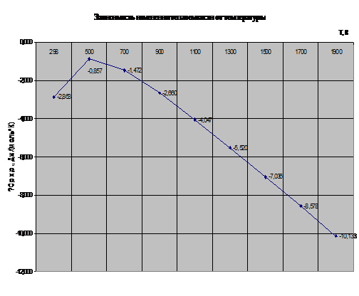 Рассмотрим график зависимости Ср от температуры (рис.4). Из него видно, что с увеличением температуры Ср уменьшается, это означает, что отношение изменения энтальпии реакции к изменению температуры развивается регрессирующие - энтальпия уменьшается тем быстрее, чем выше температура.