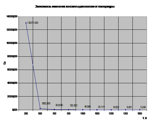 Рассмотрим график зависимости константы равновесия от температуры (рис.5). С увеличением температуры Кр убывает. В интервале температур 298-1900К Кp>>1, следовательно равновесие реакции сместится в сторону образования продуктов реакции.