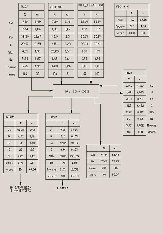 Штейн,% в том числе: Cu-30,3; Ni-2,12; Fe-4,43; S-10,7 |