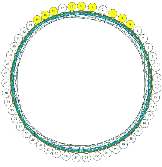 Таким образом, первую нить можно разместить в любом ВМ (например, в 0-ом), а последующие нити - на минимально возможном расстоянии от первой. Так, расстояние от нитей 2 и 3, размещённых соответственно на 48 и 1 ВМ составит единицу от первой нити, размещённой на нулевой ВМ. Аналогично на единичном расстоянии от первой нити будут находиться 4 и 5 нити, размещённые на ВМ 3 и 46 соответственно. 6 и 7 нити целесообразно разместить на 4 и 45 ВМ соответственно, тогда как 8 и 9 нити разместятся на 5 и 44 ВМ. Таким образом, нити с 2 по 9 находятся на минимальном (единичном) расстоянии от первой нити. Расстояние между ними также минимально возможным в силу конструктивным особенностей ВС типа циркулянта {49, 1, 3, 4, 5, 7}. На рисунке 16 представлено распределение нитей по ВМ ВС структуры циркулянта {49, 1, 3, 4, 5, 7} (см. также таблицу 4 в приложении 5.2).