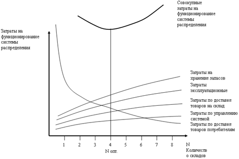 Определение оптимального количества складов в системе распределения связано с рассмотрением следующих зависимостей: