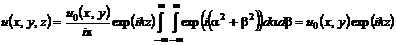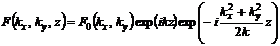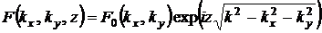 Начальное условие для уравнения (12) имеет вид: F(kx, ky, 0) = F0(kx, ky). Тогда решение (12), соответствующее волне, распространяющейся в направлении возрастания z, имеет вид плоской волны с волновым вектором