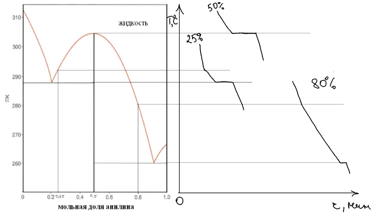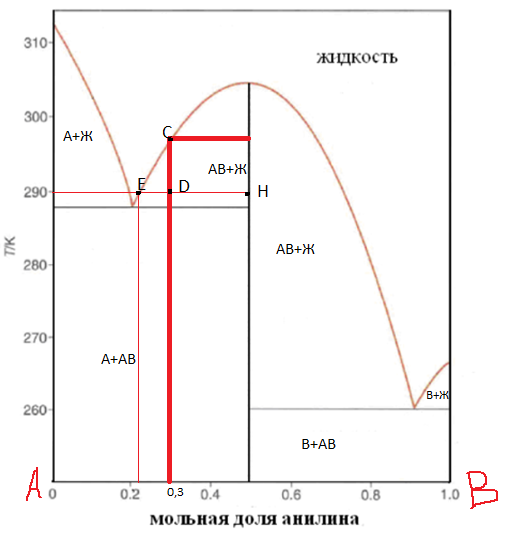 При охлаждении жидкости с составом 30% анилина-70% фенола до точки С, система свой состав не меняет. В точке С начинается выпадение кристаллов состава 50% анилина-50% фенола. В точке D система будет состоять из жидкой и кристаллической фаз.