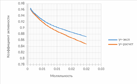 По графику видно, что значения приблизительно совпадают. Причем при меньших значениях моляльности первое приближение Дебая-Хюккеля дает меньшую погрешность, но при росте концентрации отклонения возрастают.