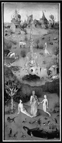 Картина "Сад земных наслаждений" состоит из четырех частей. Внешние створки выполнены в технике "гризайль", то есть, лишены цветового разнообразия, и вместе изображают третий день сотворения мира. Земля уже покрыта зеленью, окружена водой, освещена солнцем, но на ней ещё нельзя встретить ни людей, ни животных. Надпись на левой створке гласит: "Он сказал, и сделалось" (Псалтирь 32:9), на правой - "Он повелел, и явилось"(Псалтирь 148:5). С раскрытием створок зрителю представляются три взаимосвязанные части: сотворение мира слева, "Музыкальный ад" справа, и непосредственно "Сад земных наслаждений" в середине. Именно в этой части полотна Босх изобразил еще не изгнанных из рая людей, наслаждающихся жизнью, показал свою, оригинальную и весьма нестандартную трактовку рая. Мне хотелось бы заострить внимание на левой и центральной створках, именно на них Иероним Босх изобразил Парадиз в своей оригинальной символической манере.