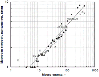 Одним из важных аспектов технологии сифонной разливки является скорость заполнения изложницы. Ее регламентируют с целью обеспечения заданного темпа повышения уровня металлического расплава в изложнице; как правило, оптимальная линейная скорость заполнения составляет 0,2…0,3 м/мин. Большие слитки, кузнечные слитки или специальные фасонные отливки обычно заполняют с меньшей скоростью, что необходимо для гарантированного формирования твердой корочки надлежащей толщины, чтобы устранить или минимизировать формирование продольных трещин.