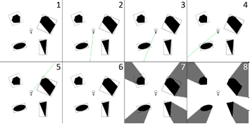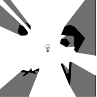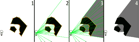 Для того, чтобы избежать подобной ситуации, предлагается использовать вышеописанный алгоритм для нахождения точек начала и конца затененных областей, но расчет теней внутри производить непосредственно методом трассировки лучей. Для этого из каждой точки найденного ранее сектора, следует пустить луч по направлению к источнику освещения. Если этот луч пересечет какой-либо объект, это будет значить, что точка находится в тени. В противном случае, ничего не загораживает точку от источника, и, соответственно, она считается освещенной. Результат представлен на Рис. 12.