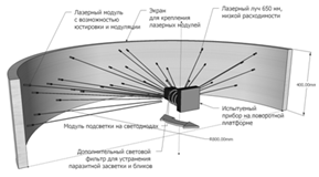 В качестве источников излучения имитирующих звёзды используются лазерные модули с лучами низкой расходимости. Модули закреплены на панорамном цилиндрическом экране с горизонтальной разверткой 170 ° (рисунки 7-9).
