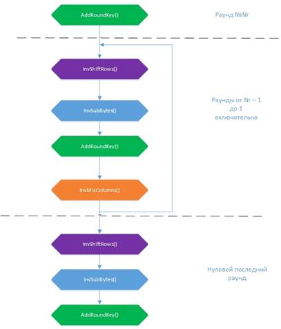 Для трансформации AddRoundKey() никаких изменений не требуется, так как трансформация обратна сама себе. Единственное отличие в том, что раундовые ключи необходимо подставлять в обратном порядке.