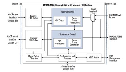 Проведем анализ рис. 36 и 37, показанные выше. Прием кадра осуществляется по дифференциальной паре с трансивера. Кадр идет последовательно с частотой 1250Мгц. Далее он поступает в десериализатор на PMA модуль. Этот модуль преобразует последовательные данные в параллельные. Далее эти данные уходят в PCS модуль. Здесь происходит 8-10 битное кодирование и синхронизация. Далее эти данные конвертируются в параллельный интерфейс SGMII (по заданным настройкам), выполняется подсчет контрольной суммы и передается в буфер памяти FIFO, откуда по шине AvalonST пользовательский модуль получает кадр. AvalonST - это шина потокового интерфейса, отличие от AvalonMM в том, что в AvalonMM имеется адресация, а в AvalonST данные непрерывно проходят пачками. При передаче информации с пользовательского модуля происходит такой же порядок действий, только наоборот.
