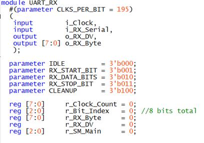Для приема сообщений с ПК(1) и для дальнейшего формирования ЭЦП был разработан модуль приемника и передатчика UART. Формат стандартен: стартовый бит, 8 бит информационных данных, стоповый бит, без контрольного бита четности. Листинг приемника FT-232 представлен на рис. 39.
