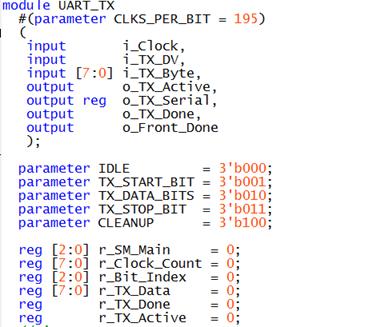 I_TX_DV - Входной сигнал о начале передачи._TX_Byte - Входной 8-разрядный регистр данных._TX_Active - Выходной сигнал, означающий активность передачи._TX_Serial - Выходной последовательный сигнал UART._TX_Done - Выходной сигнал, означающий полную передачу пакета._Front_Done -Выходной передний фронт сигнала O_TX_DONE.
