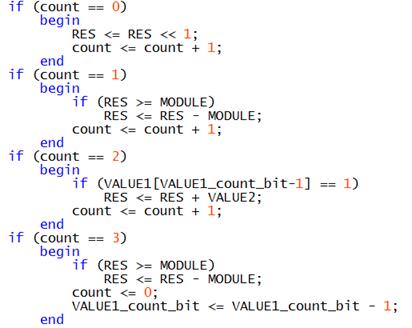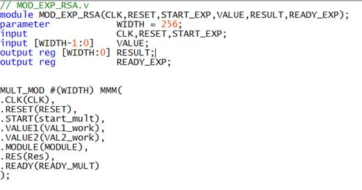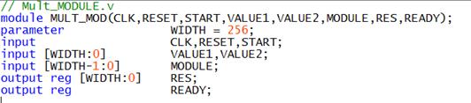 Сообщение принимается в виде 32 посылок по 8 бит. Сделано это из-за специфики алгоритма RSA. Модуль и его секретный ключ хранится в ПЛИС изначально. Размер ключа составляет 256 бит. Для формирования ЭЦП было разработано 2 модуля: модуль умножения по модулю и модуль возведения в степень по модулю. Модули являются параметризируемыми, это значит, что размеры ключа могут быть изменены перед синтезом проекта и «зашиты» в ПЛИС. Листинг модуля умножения по модулю показан на рис. 41 и 42.