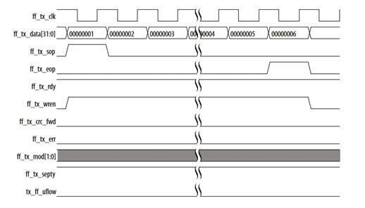 После формирования ЭЦП, по сигналу готовности модуля из памяти в модуль передатчика по Ethernet поступает части сообщения и ЭЦП по 32 бита. Первым идет сообщение, затем ЭЦП. По сигналу готовности модуль передатчика формирует сигнал ff_tx_sop и ff_tx_wren. Сигнал ff_tx_sop показывает MAC уровню о том, что пошла первая 32-разрядная пачка и переходит в активное состояние. Сигнал ff_tx_wren активен на всем промежутке передачи данных. После передачи всех 512 бит информации из памяти становится активен сигнал ff_tx_eop. Он становится активным, когда из памяти приходит последняя посылка. Временная диаграмма цикла передачи показана на рис. 44.