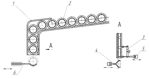 привод отсекателя (пневмоцилиндр); 6 - питатель.